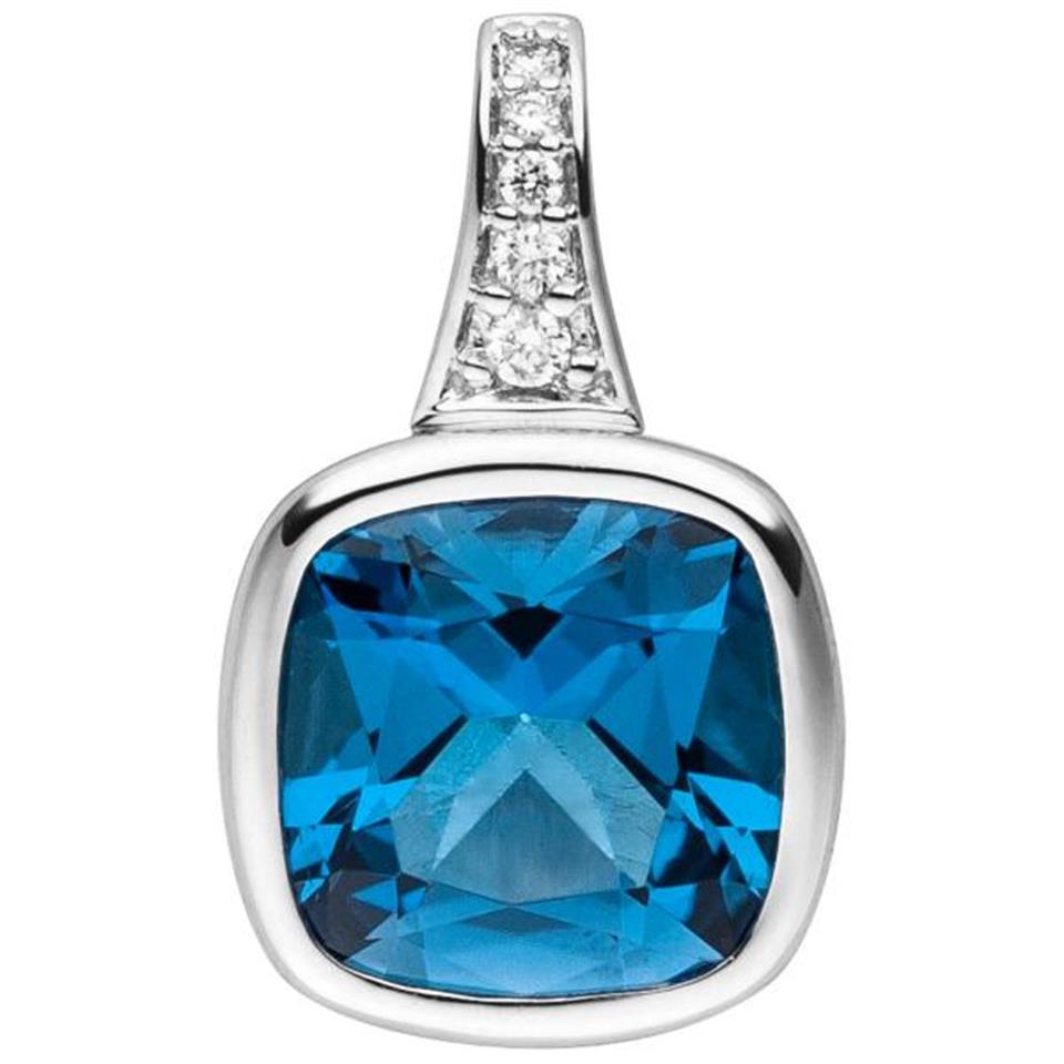 Anhänger aus 14 Karat (585) Weißgold mit einem Blautopas London Blue und 5 Diamant-Brillanten, 0,035 ct., W/SI wesselton (weiß), SI=(kleine, mit bloßem Auge nicht erkennbare natürliche Einschlüsse), Feinbearbeitung gut Höhe ca. 18,2 mm Breite ca. 11 mm Tiefe ca. 5,4 mm Innenmaße der Öse ca. 6 mm x 2,2 mm Gewicht ca. 2,6 g * Bitte beachten Sie die Maße! Auf dem Foto kann der Artikel größer wirken *