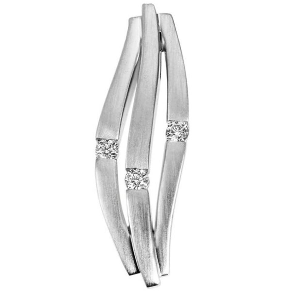 Anhänger aus 14 Karat (585) Weißgold, teilmattiert, mit 3 Diamant-Brillanten, 0,10 ct., W/SI wesselton (weiß), SI=(kleine, mit bloßem Auge nicht erkennbare natürliche Einschlüsse), Feinbearbeitung gut Höhe ca. 24,5 mm Breite ca. 7,7 mm Tiefe ca. 4,5 mm Innenmaße der Öse ca. 4,3 mm x 2 mm Gewicht ca. 3,5 g * Bitte beachten Sie die Maße! Auf dem Foto kann der Artikel größer wirken *