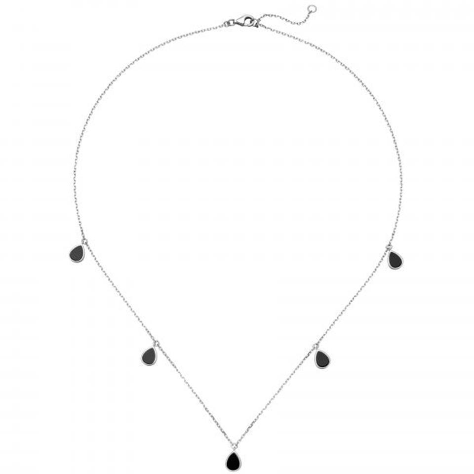 Collier / Halskette aus 925 Sterlingsilber, rhodiniert, mit 5 Onyxen und Karabinerverschluss. Länge ca. 45 cm, auf 42 cm verkürzbar Kettenstärke ca. 1 mm x 1 mm Gewicht ca. 2,6 g Der Artikel ist anlaufgeschützt (rhodiniert) * Bitte beachten Sie die Maße! Auf dem Foto kann der Artikel größer wirken *
