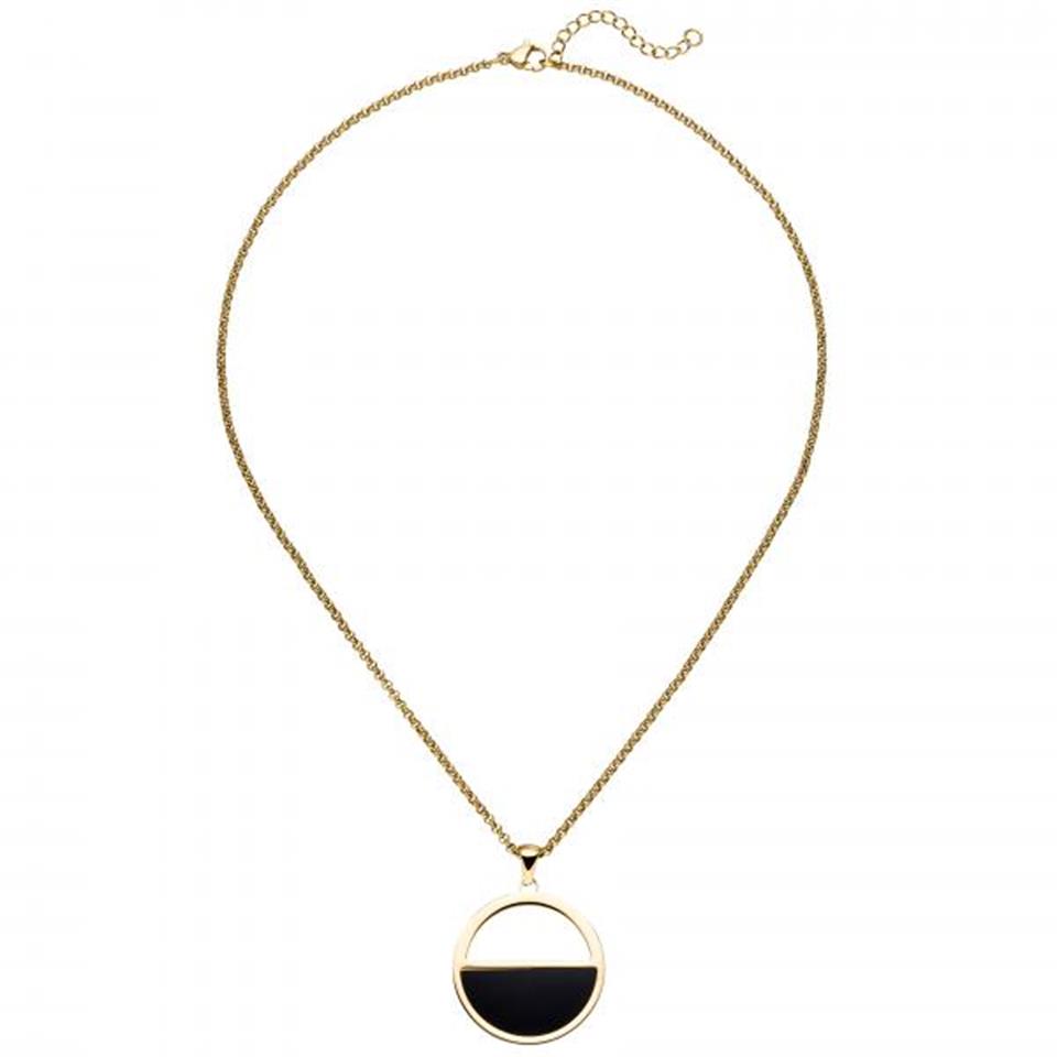 Collier / Erbkette aus Edelstahl mit gelbgoldfarbener PVD-Beschichtung, mit schwarzer Acryl Einlage kombiniert, mit Karabinerverschluss Länge ca. 45,5 cm, auf 41,5 cm verkürzbar Durchmesser ca. 27,8 mm Kettenstärke ca. 1,7 mm x 1,7 mm Tiefe ca. 1,9 mm Gewicht ca. 9,6 g * Bitte beachten Sie die Maße! Auf dem Foto kann der Artikel größer wirken *