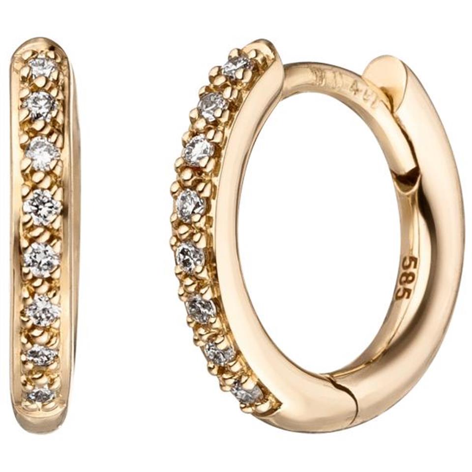 1 Paar Creolen aus 14 Karat (585) Gelbgold mit 16 Diamant-Brillanten, 0,08 ct., W/SI wesselton (weiß), SI=(kleine, mit bloßem Auge nicht erkennbare natürliche Einschlüsse), Feinbearbeitung gut. Außendurchmesser ca. 12,1 mm Breite ca. 1,7 mm Gewicht ca. 1,7 g * Bitte beachten Sie die Maße! Auf dem Foto kann der Artikel größer wirken *