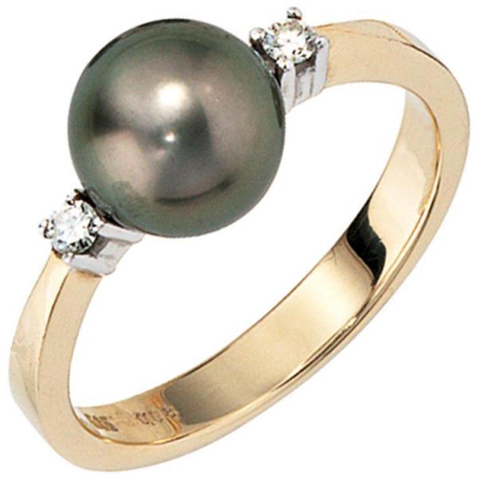 Damenring 14 Karat (585) Gelbgold, teilrhodiniert, mit einer Tahiti-Zuchtperle und 2 Diamant-Brillanten, 0,08 ct., W/P1 wesselton (weiß), 1. Piqué‚ (mit bloßem Auge schwer erkennbare natürliche Einschlüsse), Feinbearbeitung gut, Breite ca. 9 mm, Tiefe