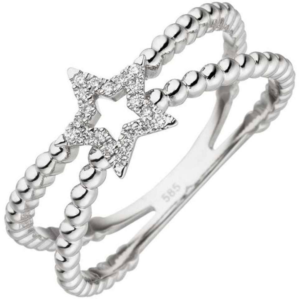 Damenring "Stern" aus 14 Karat (585) Weißgold mit 20 Diamant-Brillanten, 0,07 ct., W/SI wesselton (weiß), SI=(kleine, mit bloßem Auge nicht erkennbare natürliche Einschlüsse), Feinbearbeitung gut Breite ca. 7,8 mm Tiefe ca. 2,3 mm Gewicht ca. 3,0 g * Bitte beachten Sie die Maße! Auf dem Foto kann der Artikel größer wirken *