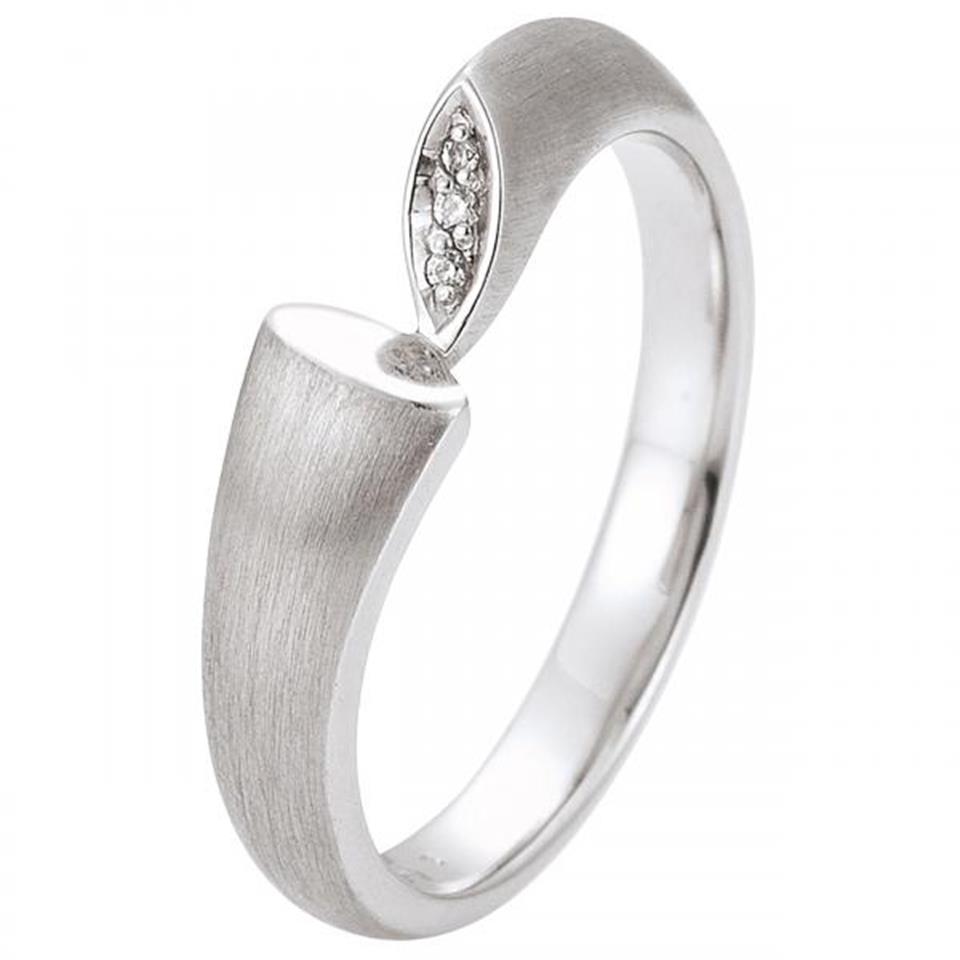 Damenring in der Größe 50 aus 14 Karat (585) Weißgold, teilmattiert, mit 3 Diamant-Brillanten, 0,019 ct., W/SI wesselton (weiß), SI=(kleine, mit bloßem Auge nicht erkennbare natürliche Einschlüsse), Feinbearbeitung gut Breite ca. 5,2 mm Tiefe ca. 4,6 mm Gewicht ca. 3,7 g * Bitte beachten Sie die Maße! Auf dem Foto kann der Artikel größer wirken *