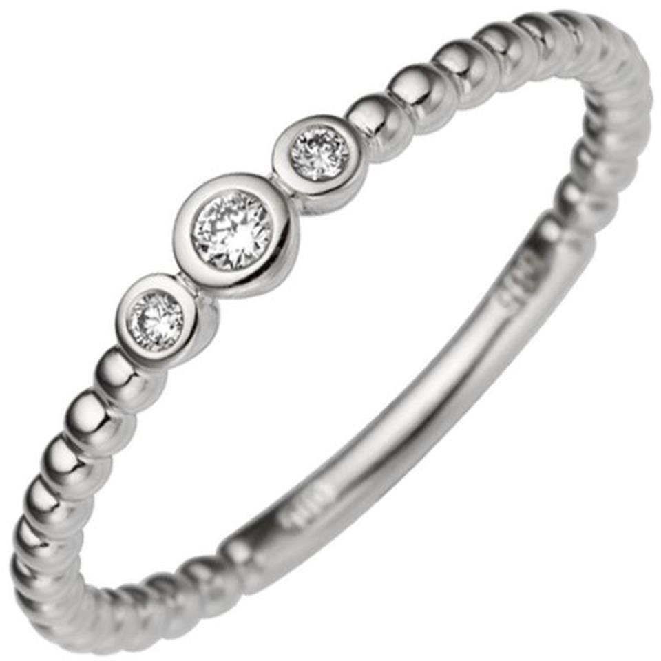 Damenring 14 Karat (585) Weißgold mit 3 Diamant-Brillanten, 0,06 ct., W/SI wesselton (weiß), SI=(kleine, mit bloßem Auge nicht erkennbare natürliche Einschlüsse), Feinbearbeitung gut, Breite ca. 3 mm, Tiefe ca. 2,4 mm, Gewicht ca. 1,6 g * Bitte beachten Sie die Maße! Auf dem Foto kann der Artikel größer wirken *cht