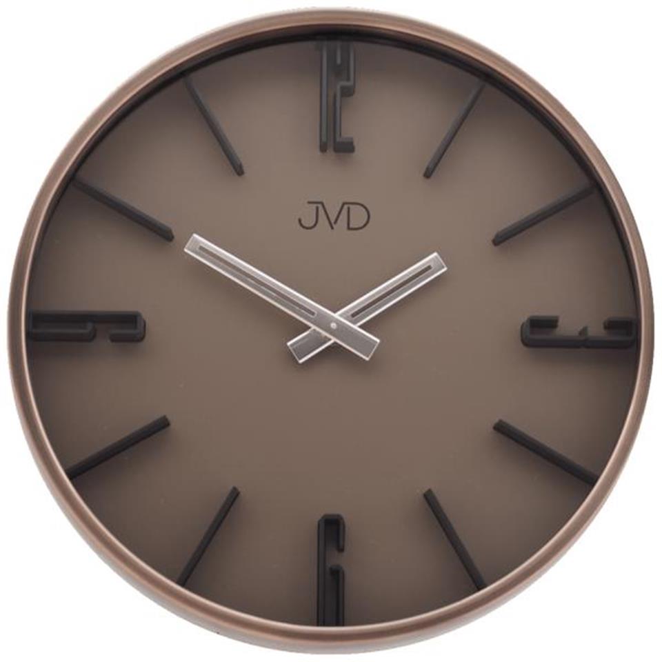 JVD HC17.1 Quarz-Wanduhr, Metallrahmen rotgoldfarben, rund, braunes Zifferblatt, erhabene Strichskala und erhabene arabische Zahlen schwarz, Zeiger silberfarben. Durchmesser ca. 30 cm Tiefe ca. 5,5 cm Gewicht ca. 950,0 g