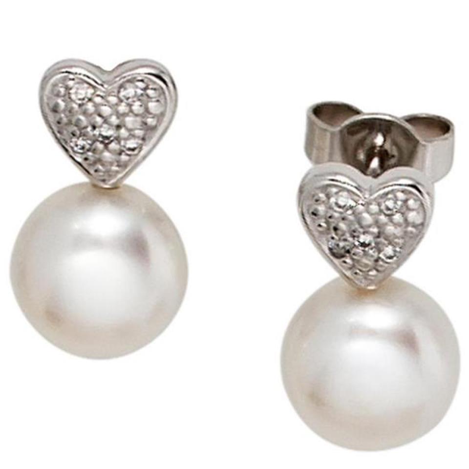 Ohrstecker Herz 585 Weißgold 2 Süßwasser Perlen 10 Diamanten